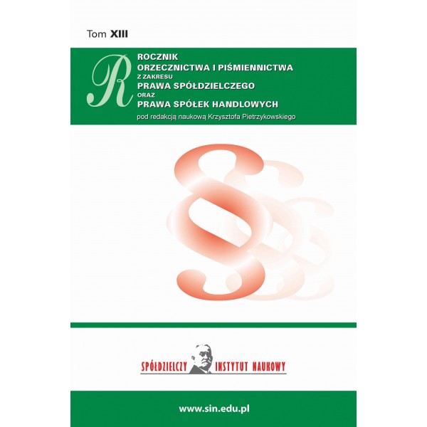 Rocznik orzecznictwa i piśmiennictwa z zakresu prawa spółdzielczego powstał z inicjatywy Rady Naukowej Instytutu Stefczyka (obecnie: Spółdzielczego Instytutu Naukowego, którego patronem jest Pan Doktor Franciszek Stefczyk), w tym nieodżałowanych Panów Profesorów Henryka Ciocha i Adama Jedlińskiego. W ukazującym się w tym roku tomie XIII formuła Rocznika, podobnie jak w sześciu poprzednich tomach, została rozszerzona o wybrane zagadnienia prawa spółek handlowych.