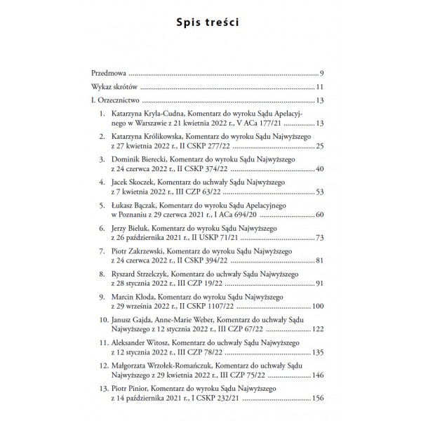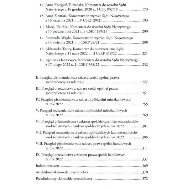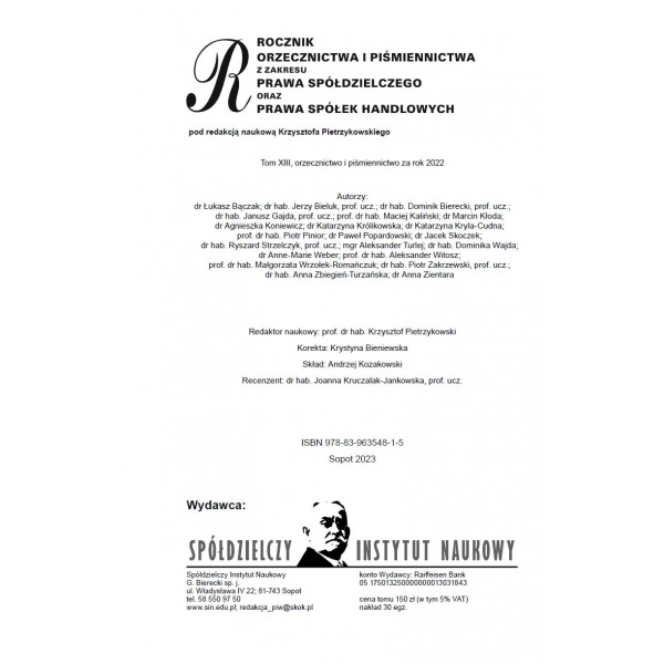 Rocznik składa się z dwóch części. Pierwsza zawiera wybór opublikowanych w roku 2022 orzeczeń Sądu Najwyższego i sądów apelacyjnych w sprawach spółdzielczych i w sprawach spółek handlowych. Orzeczenia zostały zamieszczone z uzasadnieniami i komentarzami napisanymi przez wybitnych znawców problematyki prawa spółdzielczego oraz prawa spółek handlowych. Druga część obejmuje przeglądy piśmiennictwa i orzecznictwa opracowane odrębnie w zakresie części ogólnej prawa spółdzielczego, spółdzielni mieszkaniowych, spółdzielczych kas oszczędnościowo-kredytowych i banków spółdzielczych oraz prawa spółek handlowych. W niniejszym Roczniku nie ma przeglądu piśmiennictwa i orzecznictwa z zakresu rolniczych spółdzielni produkcyjnych i spółdzielni pracy ze względu na brak publikacji i orzeczeń w tym zakresie w 2022 r.